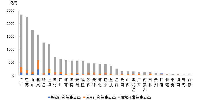 一個最常被提到的衡量指標是研發經費投入。根據《2022年全國科技經費投入統計公報》,全國R&D投入超過千億省份共有12個,其中,廣東和江蘇分別以4411.9億元和3835.4億元居於前兩位,優勢明顯。