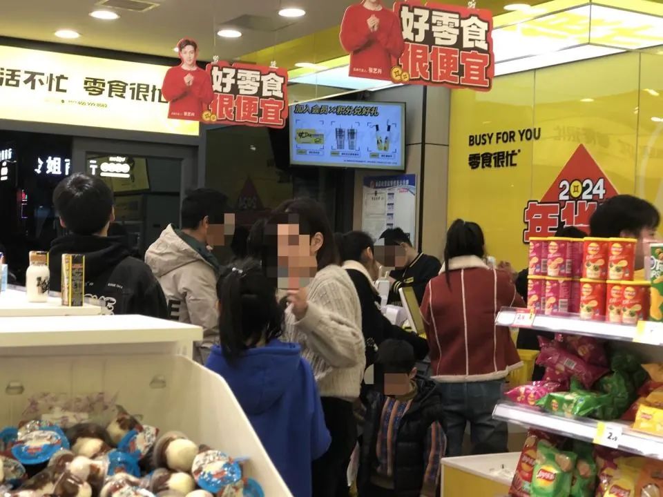 大年初三晚間,王野所在的店內人頭攢動。兩名身着套裙、妝容精緻的女子,拎起零食,感嘆“真的很便宜”。一名消費者抓起一袋零食急匆匆結賬後,稱要帶到西安去,並喊話“你們快把店開到西安吧”。