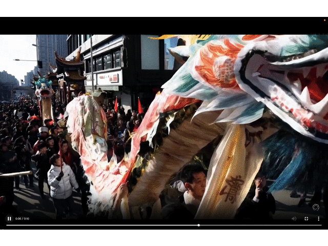 還有這段中國新年,有舞龍,街道上滿是熙熙攘攘的人羣,紅旗招展熱鬧非凡,有跟着隊伍前進的孩童,也有不少舉着手機拍攝的男女老少,很多中國人甚至都腦補不出這樣豐富的細節。