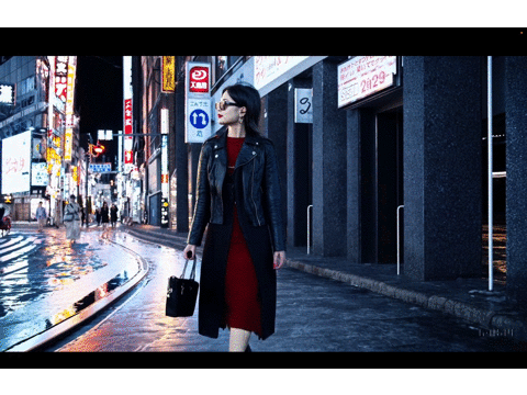 一位穿着時尚的女性走在滿布霓虹燈光和城市標牌,又人來人往的東京街道上,身着黑色皮衣、紅色長裙、黑色靴子,戴着墨鏡塗着紅唇,手拎黑色錢包。街道似乎剛下過雨,潮濕且反光,在彩色燈光的照射下形成鏡面效果。