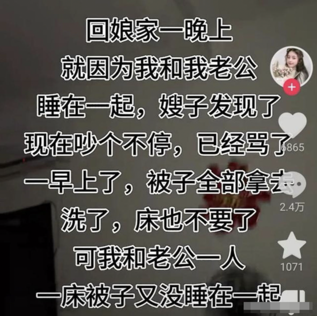 刷到一個出圈視頻,原來還存在“女子回孃家跟丈夫住一間房克哥哥”的封建説法,父母輩還在維護這樣的所謂習俗,還在持續傷害自己的子女。