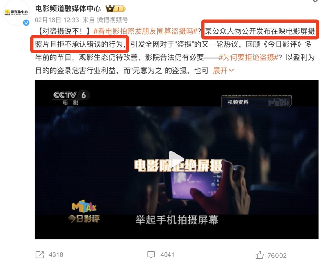 接着,電影頻道官博發表了一條關於“對盜攝説不”的微博,大致意思是説當銀幕出現龍標時,觀眾應該放下手機認真觀影。