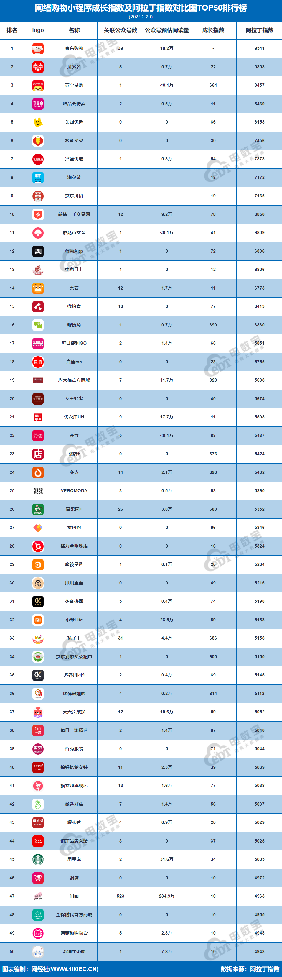 2月20日,“一帶一路”TOP10影響力社會智庫——網經社電子商務研究中心發佈《2月網絡購物小程序TOP50榜》,榜單根據“電數寶”電商大數據庫編制而成,統計時間截至2月20日。