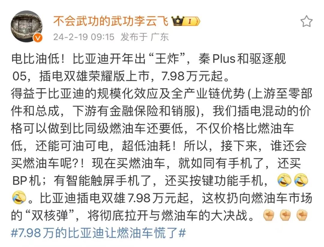 △比亞迪集團品牌及公關處總經理李雲飛發文