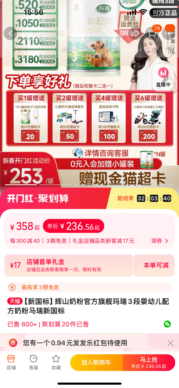 在輝山奶粉天貓旗艦店,新國標輝山瑪瑞三段奶粉券後價為236元,但銷量僅有600+。