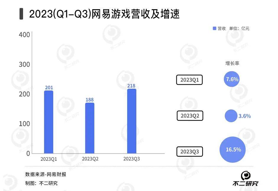 「不二研究」發現,網易遊戲及相關增值服務業務增速顯著高於前兩季度:一季度,遊戲及相關增值服務業務收入為201億,同比增長7.6%;二季度為188億,同比僅增長3.6%。