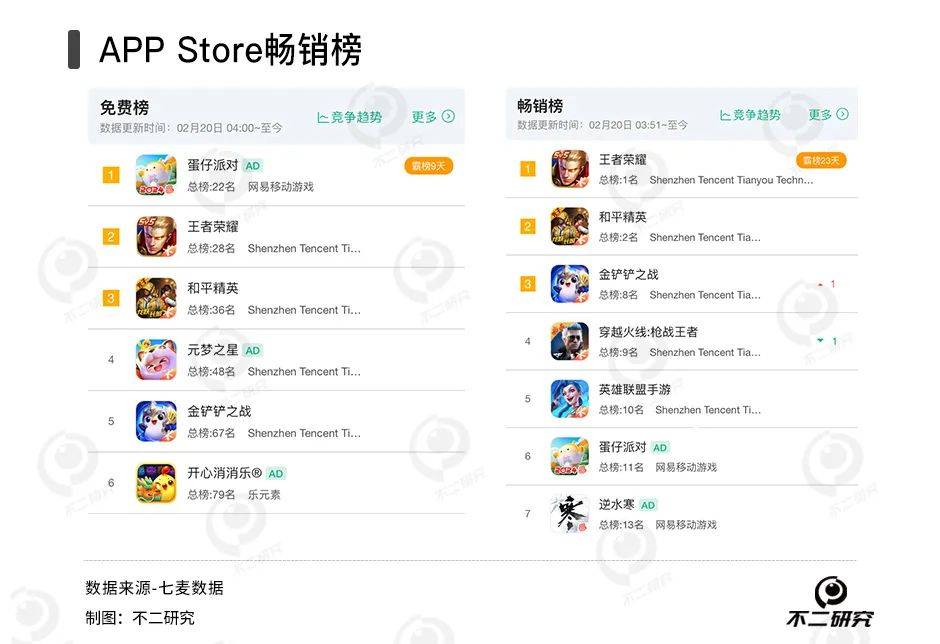 根據2024年1月中國區 App Store 手遊收入榜,排名前20的遊戲產品騰訊、網易各佔有9款、3款;其中,騰訊的《王者榮耀》《和平精英》、網易的《逆水寒》位列前三。