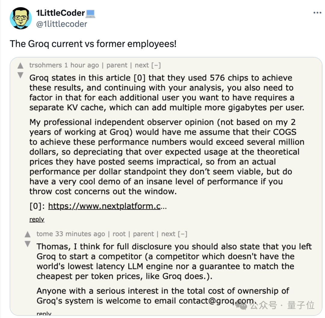 參與到Groq成本問題討論的,有計算機學生,也有同提供推理服務的雲廠商,甚至還有Groq前員工大戰現員工……好不熱鬧。