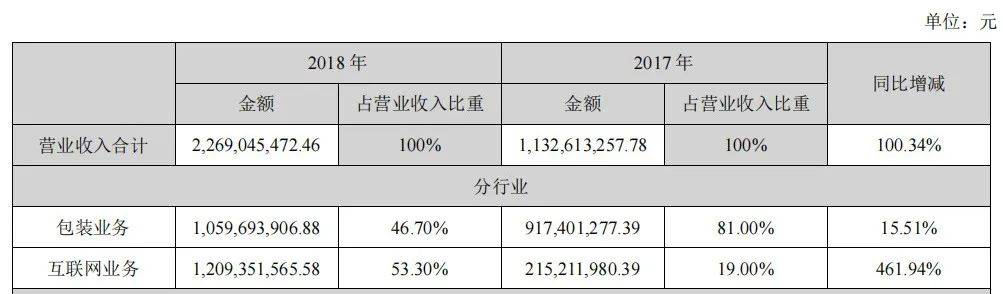 數據顯示,2018年,吉宏股份互聯網業務收入達12.09億元,超越包裝業務成為公司第一大業務。而互聯網業務中,大部分收入是由跨境電商業務貢獻。作為對比,2017年,吉宏股份互聯網業務收入僅為2.15億元。