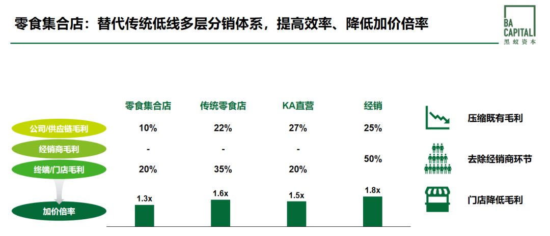 1、零食集合店:替代傳統低線多層分銷體系,提高效率、降低加價倍率
