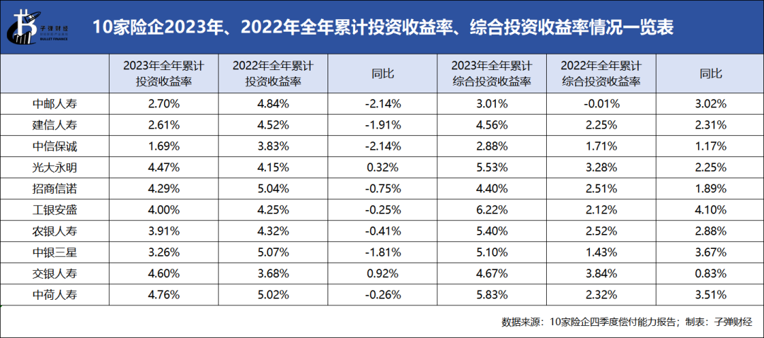 此外,在2023年權益市場持續低位運行的背景下,上述10家銀行系險企綜合投資收益率均為正,較去年同期均有所增長。