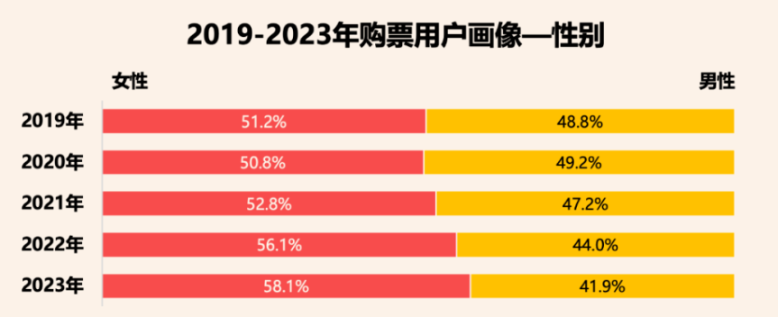 根據燈塔數據顯示,女性觀眾連續三年上漲,2023年女性觀眾佔比攀升至58%,女性的觀影需求逐漸主導市場,而電影作品的女性角色也成為了受關注的對象。