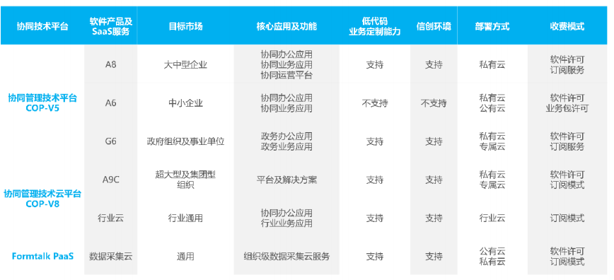 目前,致遠互聯已經擁有COP-V5、COP-V8兩大技術平台,原有A8、G6產品也融入其中。此外,還在原有產品基礎上加入了其他功能。