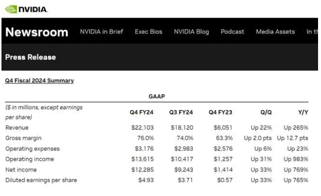 英偉達當天公佈的財報數據顯示,按照美國通用會計準則,第四季度收入221億美元,同比增長265%,淨利潤122.85億美元,同比增長769%。這兩項關鍵指標雙雙超出市場預期。