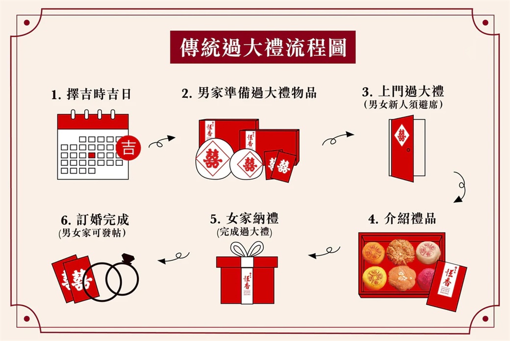 「過大禮」其實只是「六禮」中的一部分,現代都市人生活繁忙,當然無法完整重現古代的繁文縟節,但華人社會,仍然視「過大禮」為家庭婚嫁的正式程序,代表男女雙方的婚約正式展開。