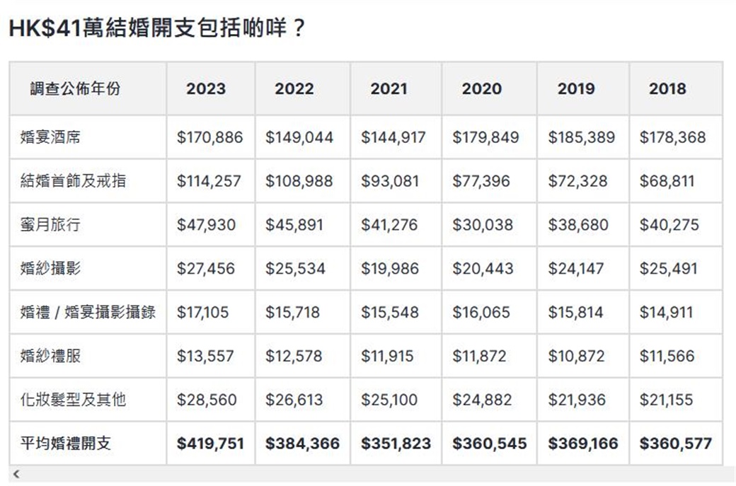 首先,要從結婚各項支出的“公價”説起,這裏的“公價”,大致可看作是中位數。(香港富豪的婚禮,不包含在這裏。)