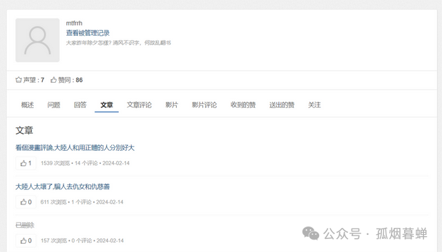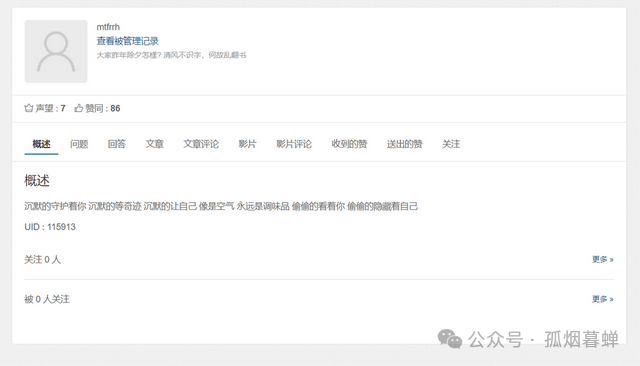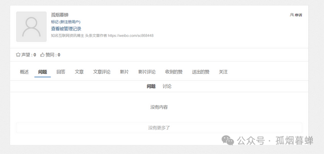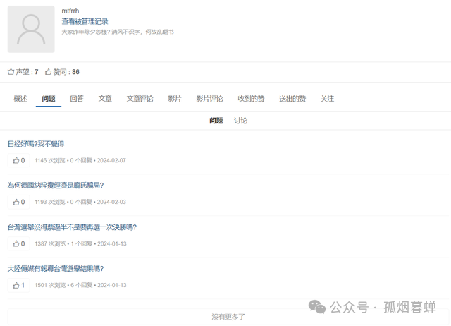 這就奇了怪了,我尋思我怎麼就不知道我開過這麼個號呢?我連這個平台都是頭一回聽説。看了一眼朋友發過來的這個“孤煙暮蟬”發在這個網站上的4個問題和56篇帖子的截圖,我這才明白了。好嘛,我這是李逵撞見李鬼了。乍一看好像是孤煙暮蟬,結果仔細一瞧,其實是子瓜火因暮蟲單。