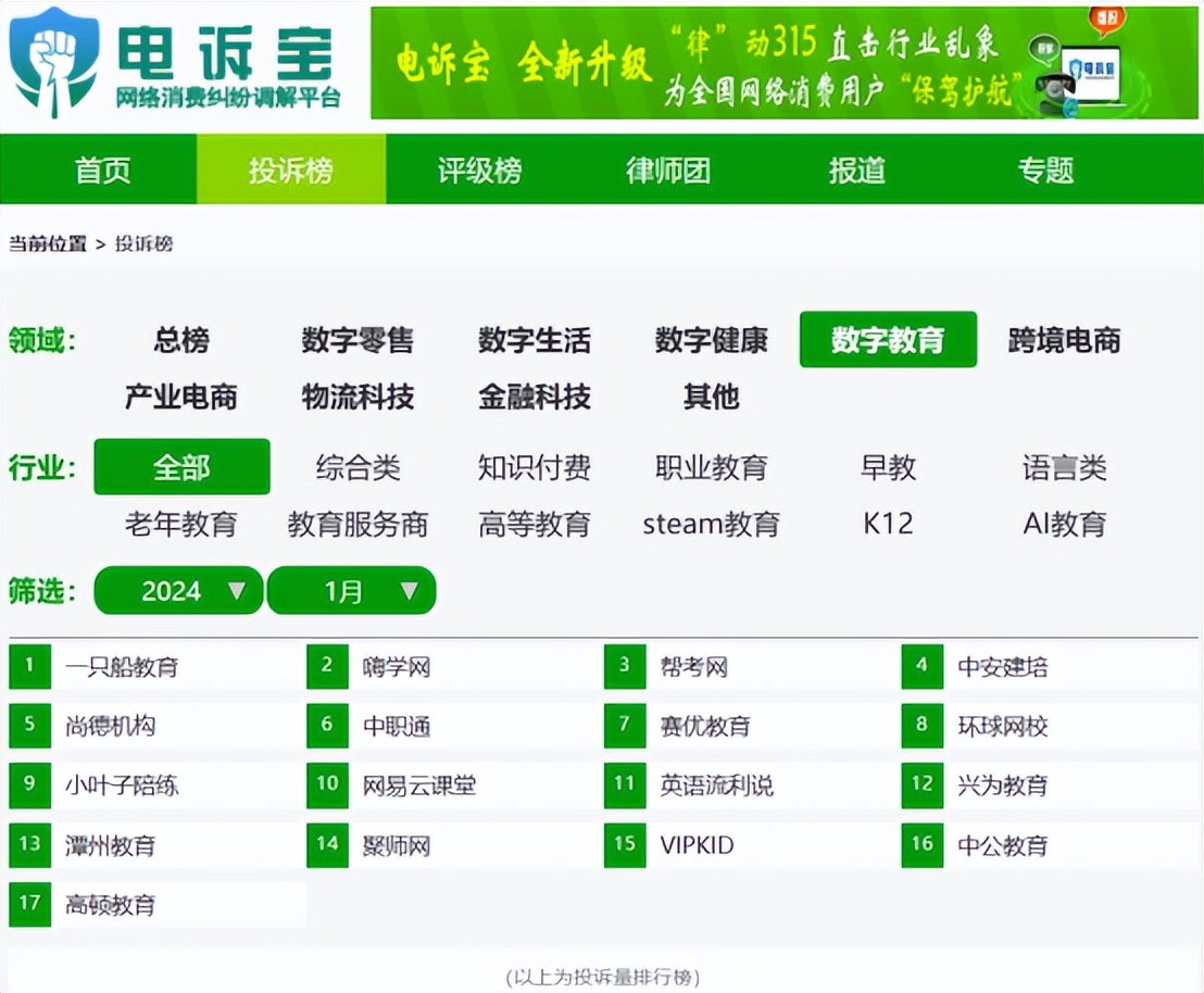 投訴量TOP10依次為:一隻船教育、嗨學網、幫考網、中安建培、尚德機構、中職通、賽優教育、小葉子陪練、網易雲課堂;