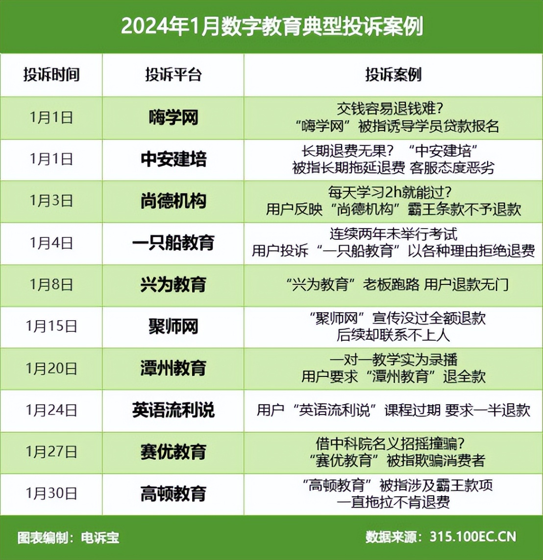 在數字教育消費領域,據“電訴寶”受理用户維權案例,我們從中選取十大典型投訴案例,涉及嗨學網、中安建培、尚德機構、一隻船教育、興為教育、聚師網、潭州教育、英語流利説、賽優教育、高頓教育。
