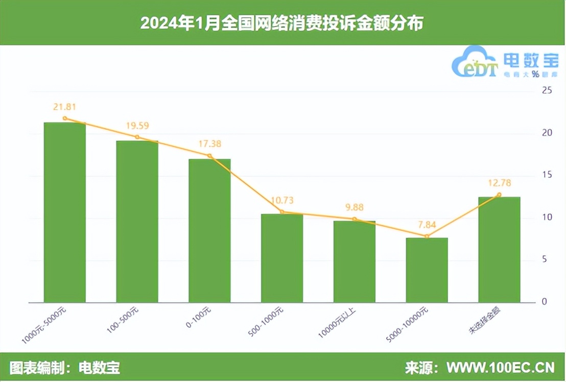 據“電訴寶”顯示,1月投訴金額分佈主要集中在1000-5000元(21.81%)、100-500元(19.59%)、0-100元(17.38%)、500-1000元(10.73%)、10000元以上(9.88%)、5000-10000元(7.84%)、未選擇金額(12.78%)。