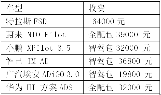 表:各新能汽車智能駕駛輔助系統收費一覽
