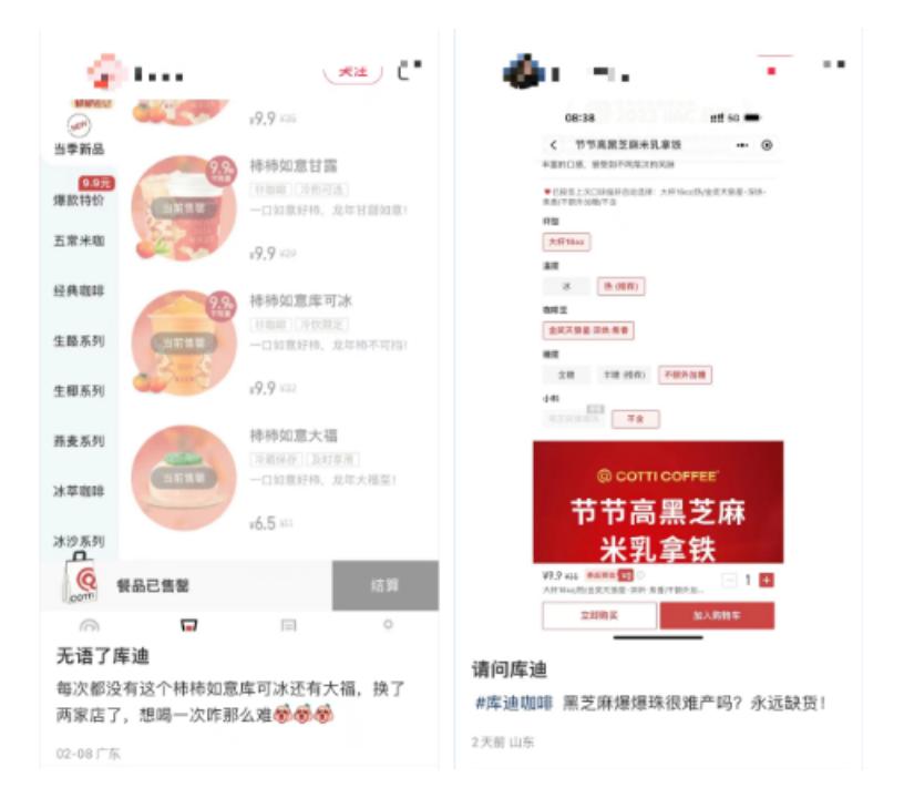而在消費者端,問題主要體現在缺貨上,有人表示像生椰拿鐵、潘帕斯藍等主打產品,庫迪都總是缺貨,吐槽道“8點多都賣完了,你這一天還賣什麼呢?”;近期更是有消費者在小紅書上抱怨,附近的庫迪門店居然連經典拿鐵都顯示缺貨……