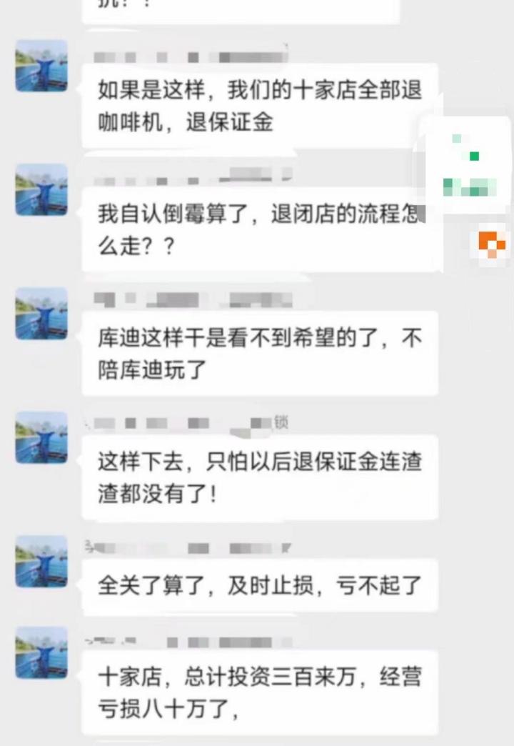 甚至有開了十家店的庫迪聯營商在微信交流羣中直言,“經營虧損八十萬了”“這樣下去只怕以後退保證金連渣渣都沒有”……