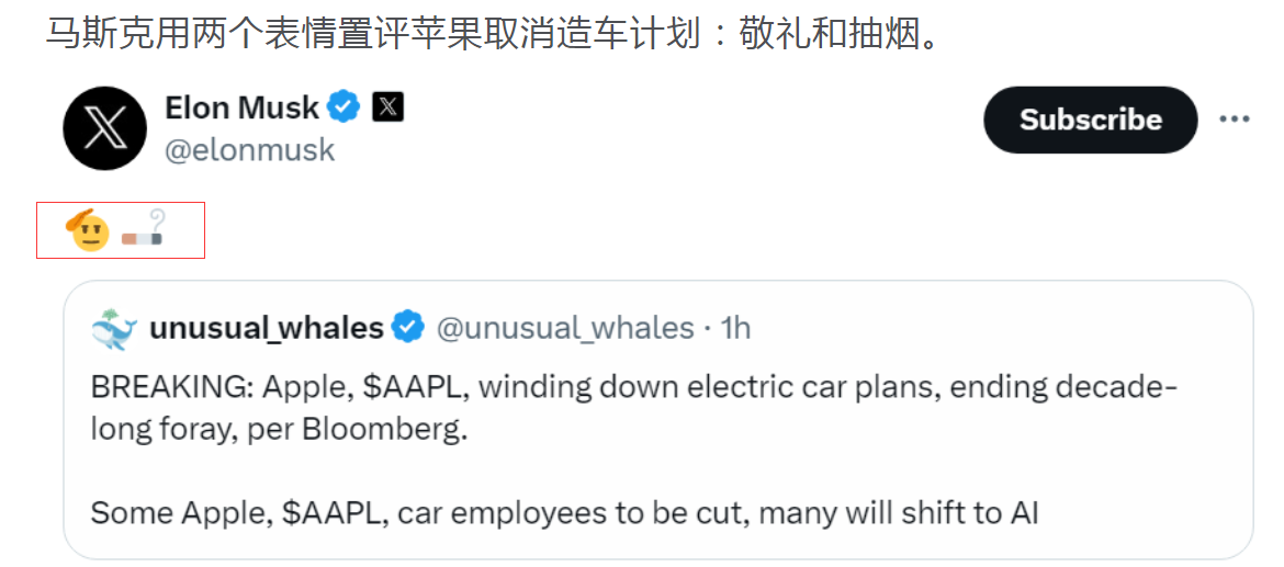 值得一提的是,特斯拉CEO馬斯克社交媒體轉發了蘋果停止造車的消息,配上了敬禮和抽煙兩個表情。