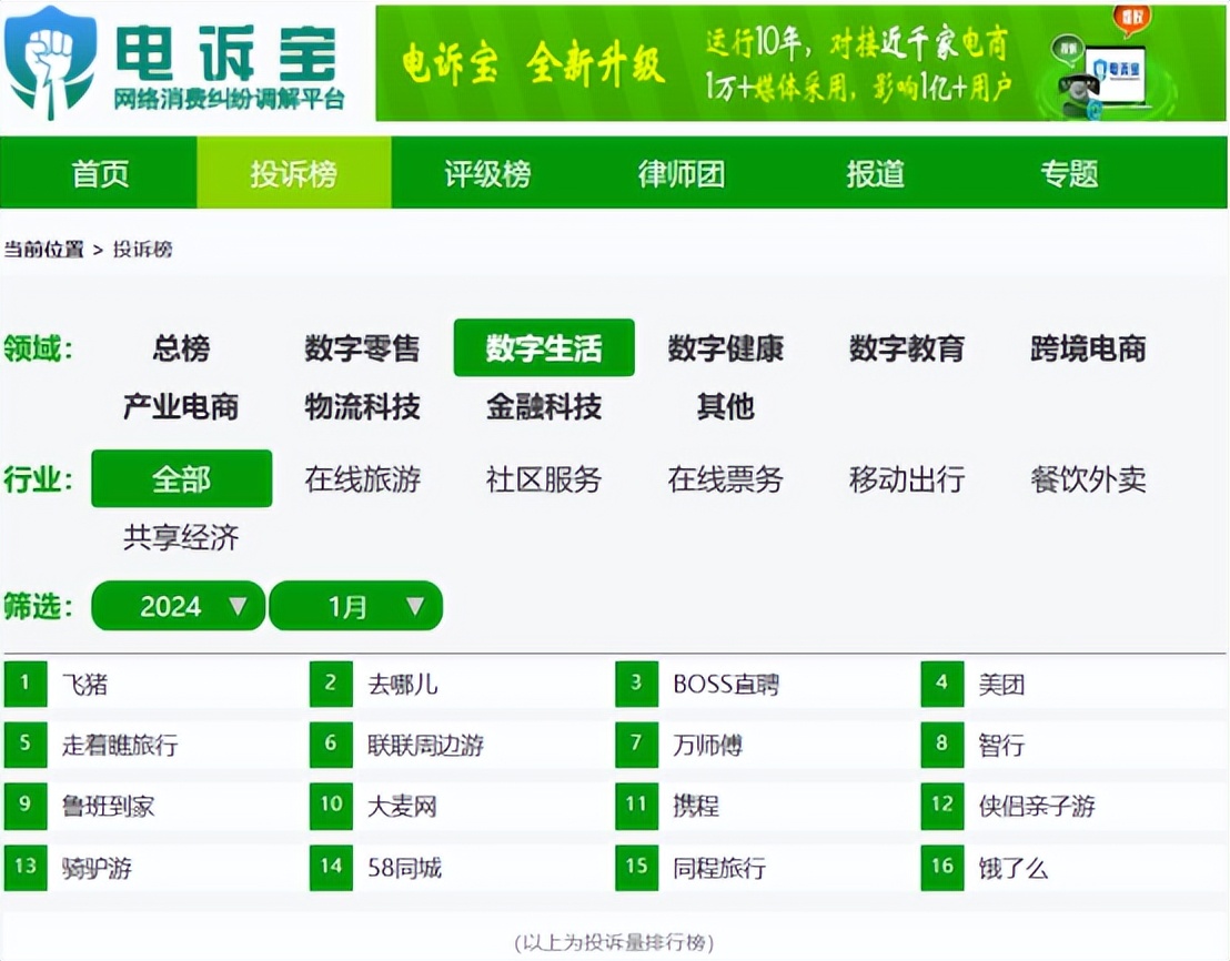 投訴量TOP10依次為:飛豬、去哪兒、BOSS直聘、美團、走着瞧旅行、聯聯周邊遊、萬師傅、智行、魯班到家、大麥網;