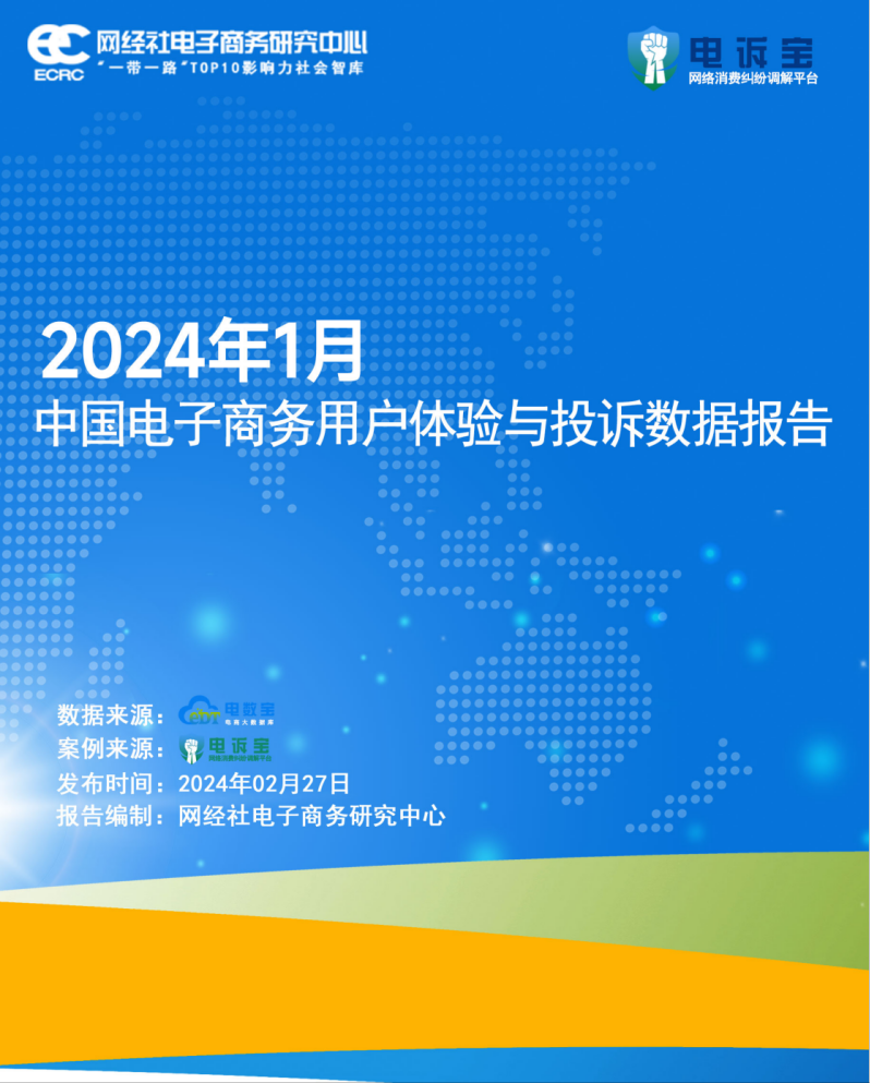 在此背景下,2月27日,依據國內知名網絡消費糾紛調解平台“電訴寶”2024年1月受理的全國78家互聯網消費平台糾紛大量案例數據,“一帶一路”TOP10影響力社會智庫網經社電子商務研究中心發佈了《2024年1月中國電子商務用户體驗與投訴數據報告》。