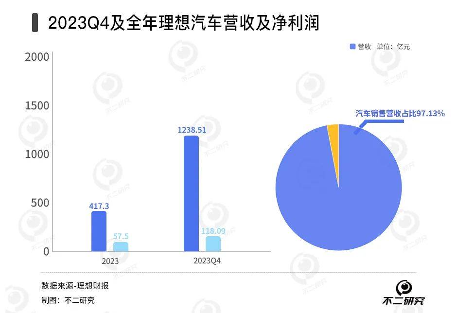 「不二研究」據其財報發現:2023年,理想汽車營收1238.5億元,同比增加173.5%;同期,其淨利潤為118.1億元,同比扭虧為盈,而2022年淨虧損20.3億元。
