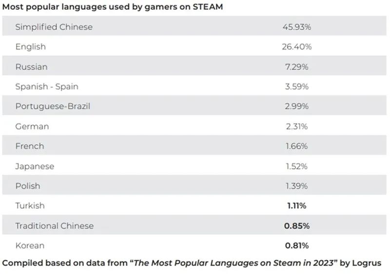 Steam上游戲玩家最常用的語言,排在第一位的是簡體中文,佔比45.93%(數據來源:Logrus,“2023 年 Steam 上使用最廣泛的語言” )