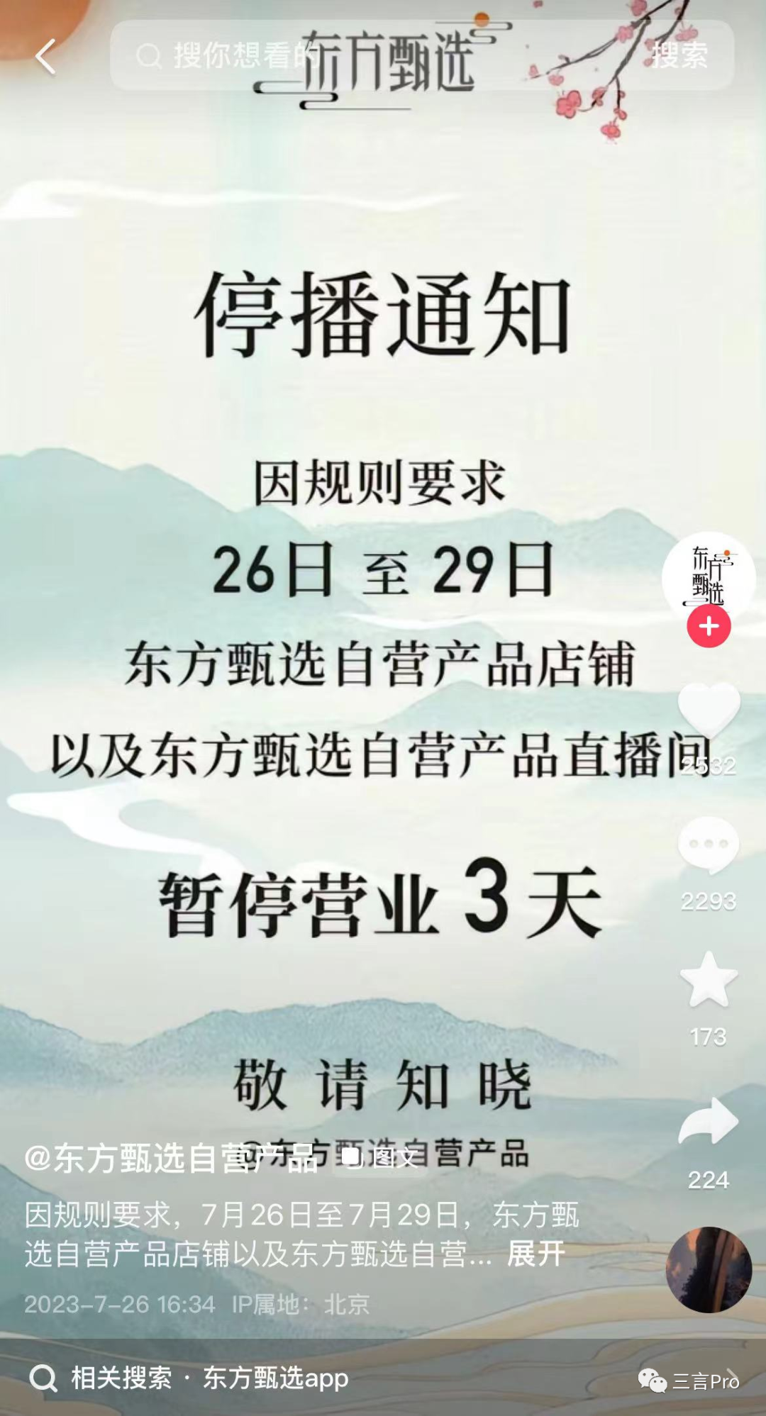 但這一切,迎來了來自綁定極深的平台的反彈。在自營平台開播期間,東方甄選曾發佈過一則關於在抖音平台停播停業三天的通知。雖然俞洪敏對外表示,這事和抖音沒有任何衝突和矛盾,但平台和品牌雙方背後是否存在博弈,依然引得外界浮想聯翩。