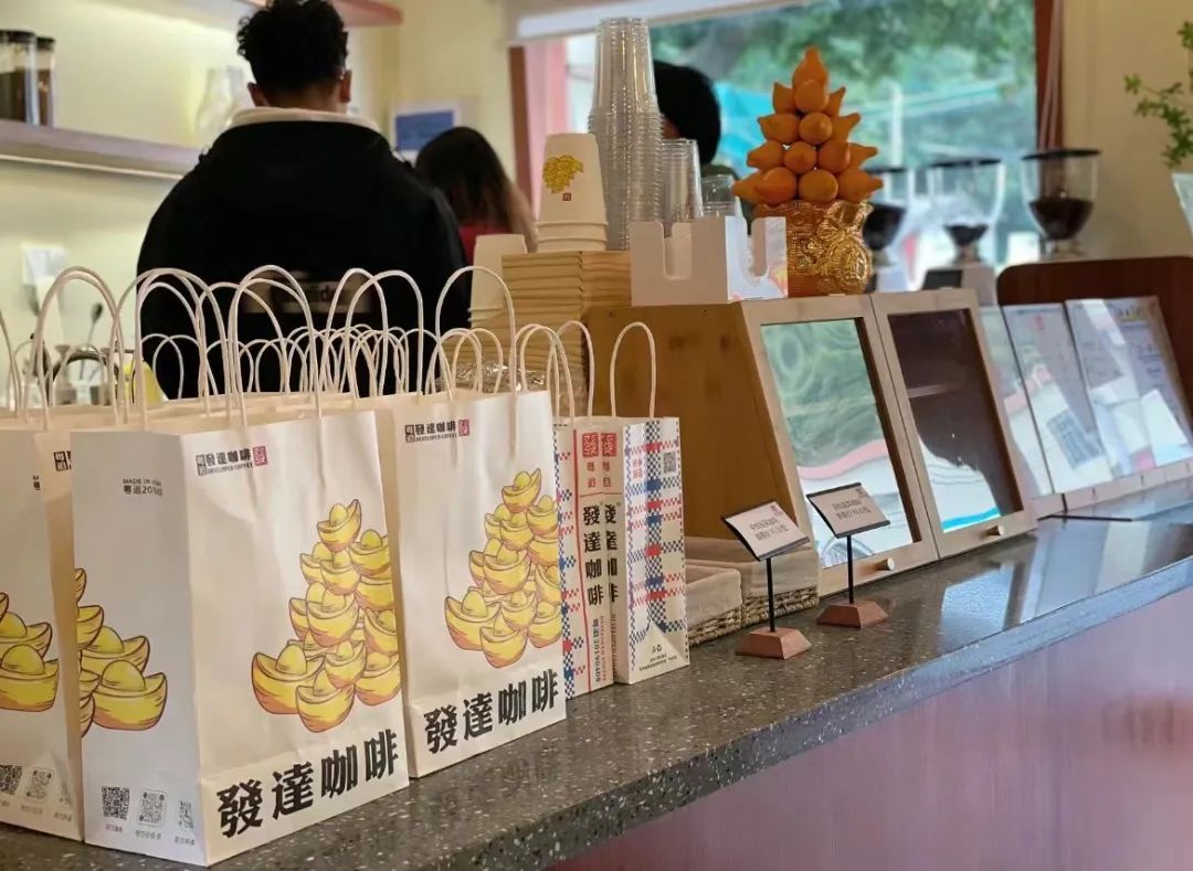 產品名也都圍繞發達的主題展開,像黃油節節高、發逹奶茶、給力冰咖啡等,就連包材上“一杯千金”也繪有金元寶等圖案,通過各種細節向消費者傳遞“發達”祝福。