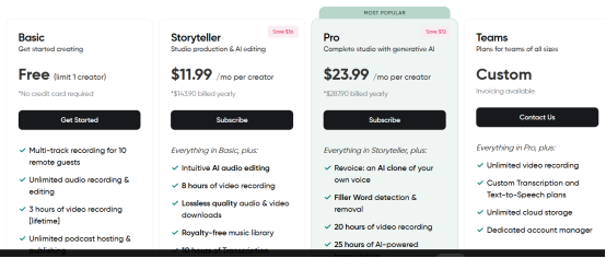 Podcastle提供不同級別的訂閲服務,包括免費版、專業版和團隊版。這些訂閲計劃為用户提供了不同層次的功能和服務,通過這種分層的定價策略,Podcastle能夠滿足不同規模和需求的播客創作者。
