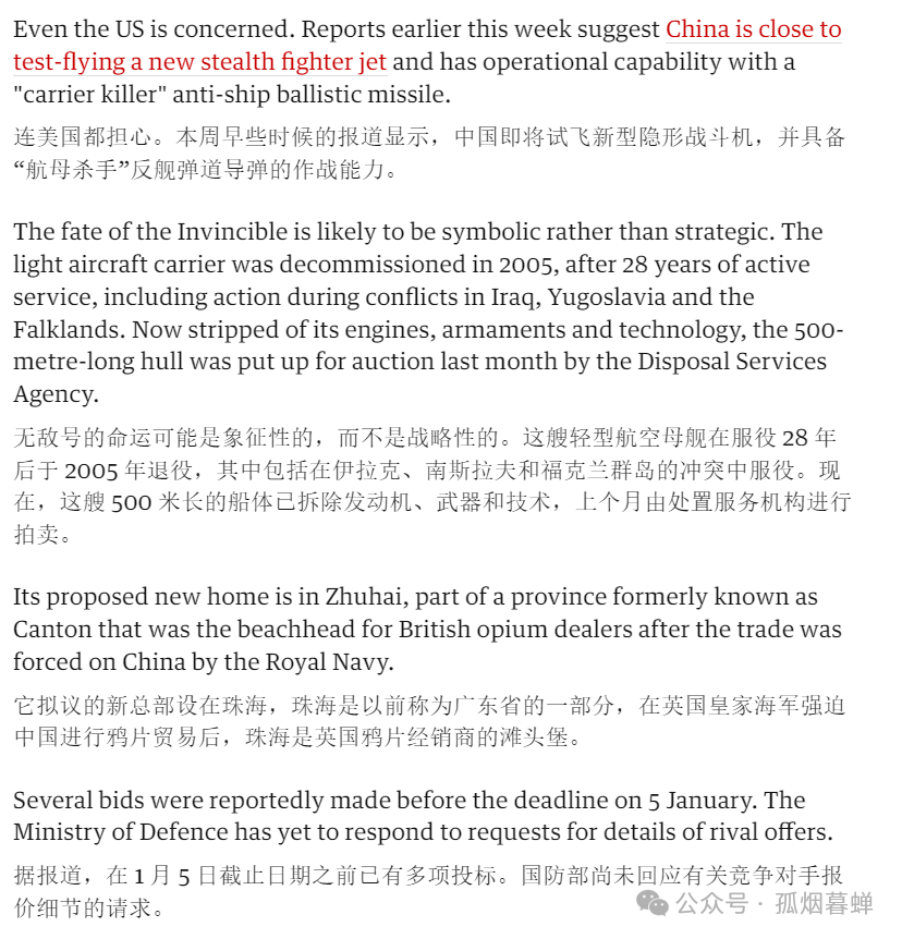 説來好笑的是,在出這期節目查閲資料的過程中,我還在《衞報》上有意外收穫。2011年1月上旬,《衞報》曾經在它們的“中國”版面上刊載過一篇題為《中國商人出價500萬英鎊,有意購買英國海軍“無敵”號航母》(Chinese businessman bids £5m for HMS Invincible)的文章。