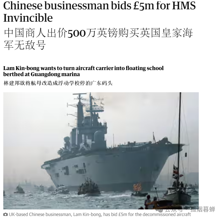 按照這篇文章裏頭提到的説法,當時有位名叫林建邦(Lam Kin-bong)旅英華商曾向英國海軍出價500萬英鎊,想從英國人的手裏把他們行將退役的“無敵”號航母給盤下來,然後拖回廣東珠海,改建成一所“海上國際學校”。