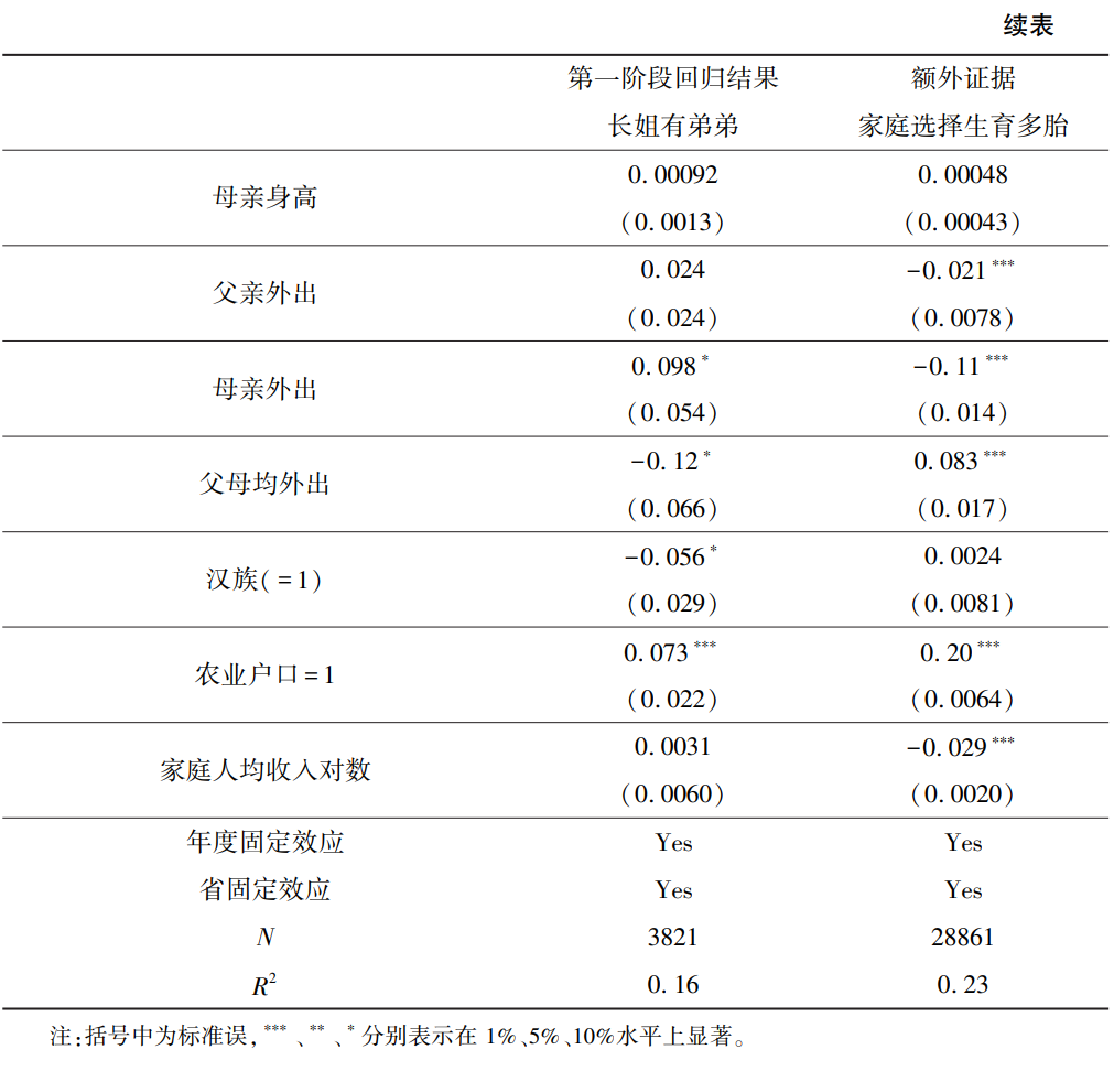 附錄表 A1 報告了第一階段迴歸結果及額外的證據。第 1 列結果顯示,同村其他家庭頭胎男孩的比例與長姐有弟弟顯著正相關,當前者越高時,長姐越可能有弟弟。第 2 列,我們提供同村中其他家庭頭胎男孩的比率與家庭選擇生育二孩及更多孩子正相關的額外證據。迴歸發現,同村中其他家庭頭胎男孩的比率越高,家庭選擇繼續生育的概率顯著更高。表 A2 **報告了二孩家庭分胎次的性別結構,二孩家庭主要呈現“女男”結構,即第一胎多為女孩,第二胎多為男孩。這表明生育二孩的家 庭多是在頭胎生育女孩後繼續生育二孩,而二孩為男孩的概率相對較高,表現出一定的性別選擇。**表 A3 報告了生育三孩及以上家庭的性別結構,主要呈現出“女女 男”的趨勢,即三孩及以上的家庭,第一胎多為女孩,第二胎也多為女孩,第三胎為男孩的概率相對較高,第四胎及以上為男孩的概率也相對較高,表現出一定的性別選擇。三張表格結合起來,可以説明,外生的同村中其他家庭頭胎男孩的比率內化作用於家庭同胞性別結構,使得長姐有弟弟的概率更高。因此,本文的工具變量與內生變量具有顯著的相關性,滿足成為工具變量的第一個條件。