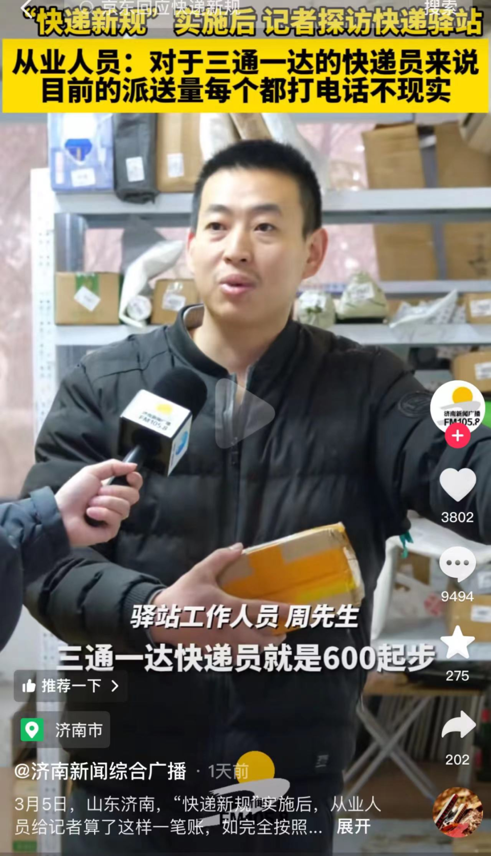 濟南的一位快遞驛站工作人員在視頻中提到,“京東順豐的快遞員他們一天的派件量應該是在100票左右,三通一達快遞員是600起步,平均下來一分鐘打一個電話,就要7個小時,還不包括送件,不太現實。”