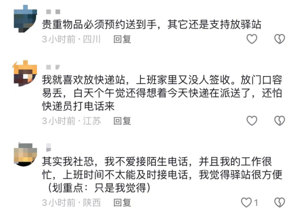 與李睿有類似想法的人不在少數,在社交平台相關話題的評論區,有不少網友覺得“驛站”“快遞櫃”更方便。