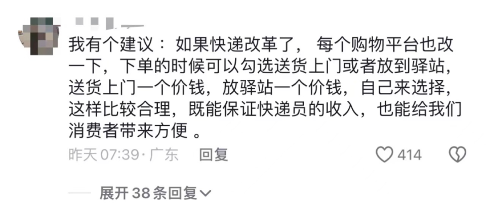 也有網友提議:“如果快遞改革了,每個購物平台也改一下,下單的時候可以勾選送貨上門或者放到驛站,送貨上門一個價錢,放驛站一個價錢,自己來選擇,這樣比較合理,既能保證快遞員的收入,也能給我們消費者帶來方便 。”