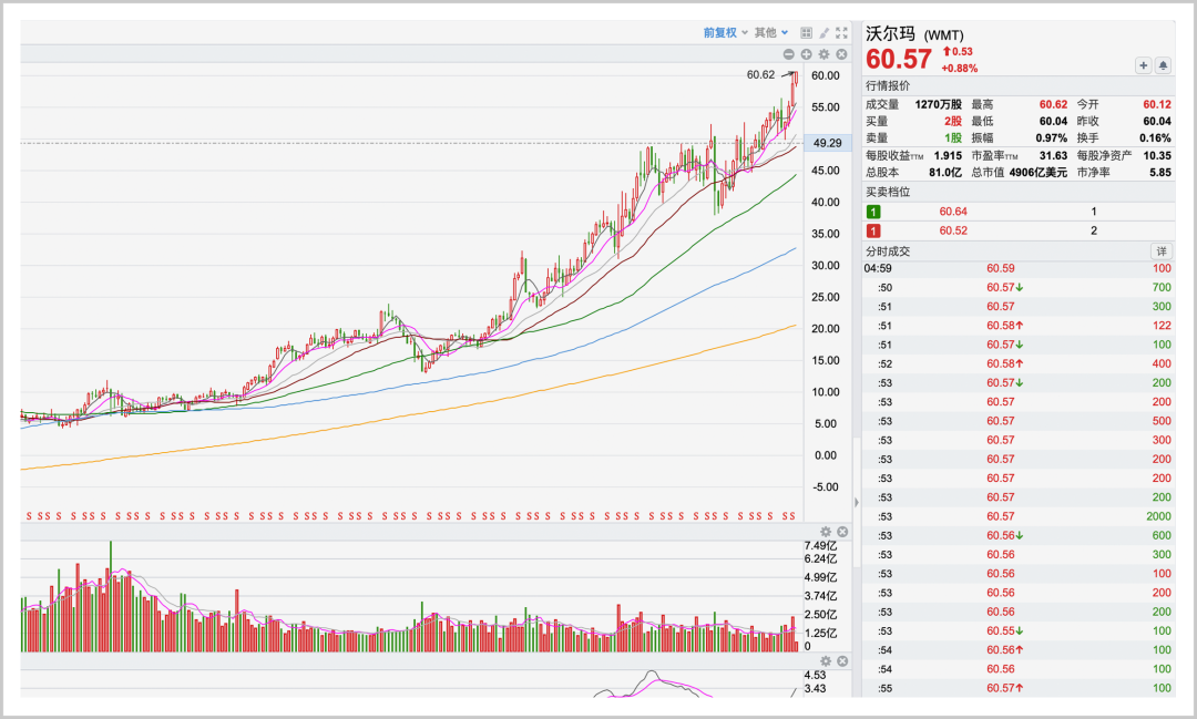 2020年初到今年3月初,美國沃爾瑪的股價從35美元左右升至60美元左右並創歷史新高,開市客(Costco)則更猛,股價從250美元左右飆升到超過770美元同樣創歷史新高。