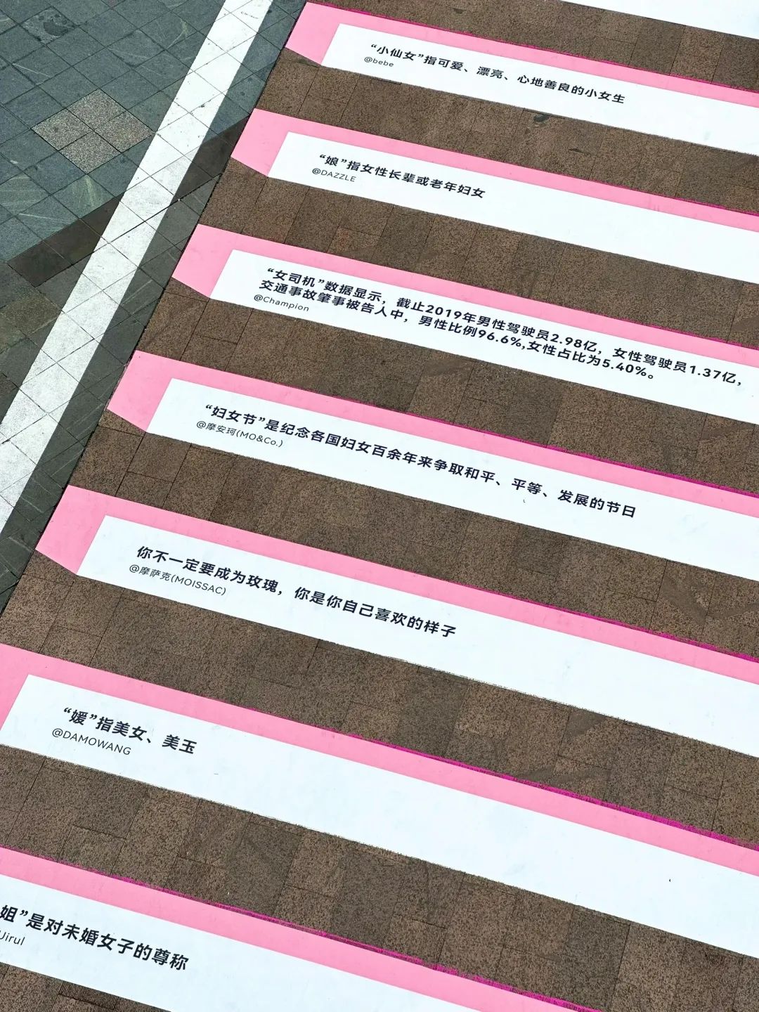 在觀音橋龍湖重慶北城天街,重慶人流量最大的商圈,商場入口處的十字路口,粉紅色的標語,內容既有彰顯婦女節由來的典故,也觸及了網絡文化中關於女性角色標籤的討論,如“小姐”、“聖母”、“媛”等飽含複雜含義的社會符號。對於喜歡這些標語的女性而言,這種嘗試既是對女性身份多元化的正面肯定,也是對性別刻板印象的一次挑戰。
