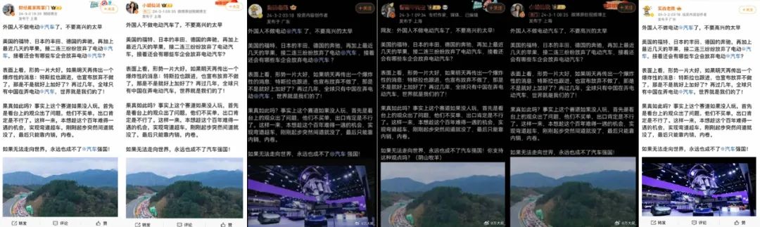 第五個波次,是組織某些我國的網絡大V 在我國的網絡發通稿,散佈所謂的因為外國人不做電動汽車了,所以外國人就不購買電動汽車了,所以中國就只能內卷,中國就一定會輸,而外國人就一定會仍然贏的全面唱衰我國電動汽車產業的論調。