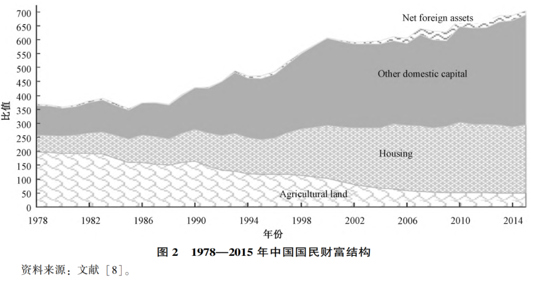 **城鄉財富不平等問題日益突出。**當前我國城鎮家庭人均財富量遠高於農村家庭。根據《中國家庭財富調查報告2019》的數據,2018年我國家庭人均財富為208883元,比上年的194332元增長了7.49%,增長速度快於GDP增速,其中農村家庭與城鎮家庭的人均財富分別是87744元和292920元,後者是前者的3.34倍。城鎮家庭的人均財富量與增速均高於農村家庭有諸多原因。城鄉居民收入不平等在其中起着重要作用。2021年城鎮居民的人均可支配收入為47411.9元,農村居民的人均可支配收入為18930.9元,前者是後者的2.5倍。城鄉居民收入的不平等傳導到財富領域必然引起城鄉居民財富差距的擴大。財富結構的變化也影響着城鄉之間的財富分配。財富結構通常由農業性用地的價值、房產淨值、其它國內資本與外國淨資產構成。其中,房產淨值是家庭財富中最重要的部分,在居民財富差距擴大的驅動因素中,房產差距可以解釋財富不平等的七成左右,且重要性仍在提升。圖2的縱座標反映了國民財富與國民收入的比值,由圖可知,改革開放以來我國國民財富與國民收入之比不斷提升,國民財富結構總體呈現出農業用地的財富價值佔比不斷下降,房產淨值、其它國內資本佔比不斷攀升的趨勢。在農村宅基地交易等未完全放開,城市家庭擁有更高房產淨值、更大資本的條件下,上述發展趨勢在現實中表現為農村家庭財富份額的下降與城市家庭的財富份額的提升。我國財富結構的變化加劇了城鄉財富的不平等。