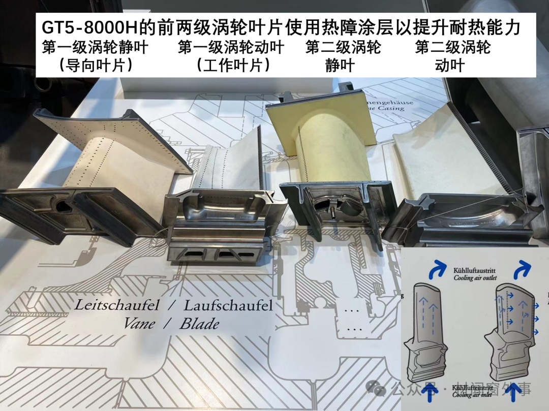 考慮到大尺寸葉片的技術難度和成本,重型燃氣輪機的渦輪不一定使用單晶葉片,而採用定向凝固葉片(比如SCT-8000H和三菱重工的J級燃氣輪機)。好在大尺寸葉片裏有足夠的空間做冷卻通道以解決耐熱問題。在葉片表面噴塗的熱障塗層起到隔熱作用。在葉片前緣還能看到幾列小孔,作用是釋放出冷卻空氣,在葉片表面形成隔絕高温的氣膜(氣膜冷卻)。