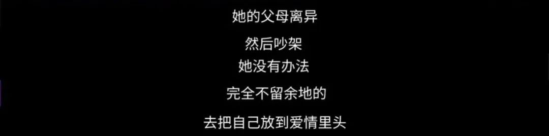 這樣破碎的家庭讓她沒辦法棲息,像無巢的鳥,只能越飛越遠,強烈不安感,也沒辦法完全不留餘地地把自己投入到愛情裏。