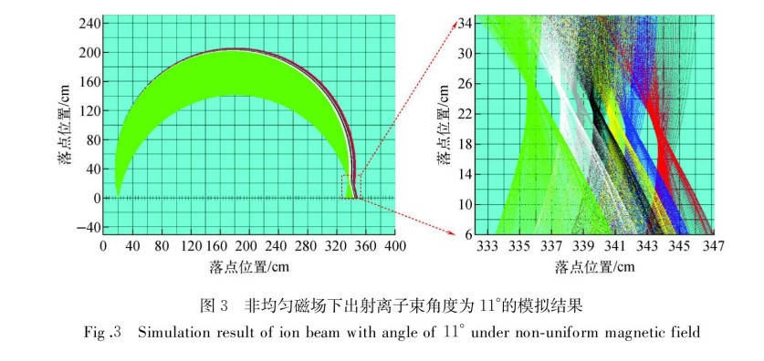 (離子束在橫向磁場作用下的弧線運動軌跡模擬圖,右邊放大圖不同顏色的線條表示不同同位素離子的偏轉半徑不同,在不同位置接收即可實現分離)