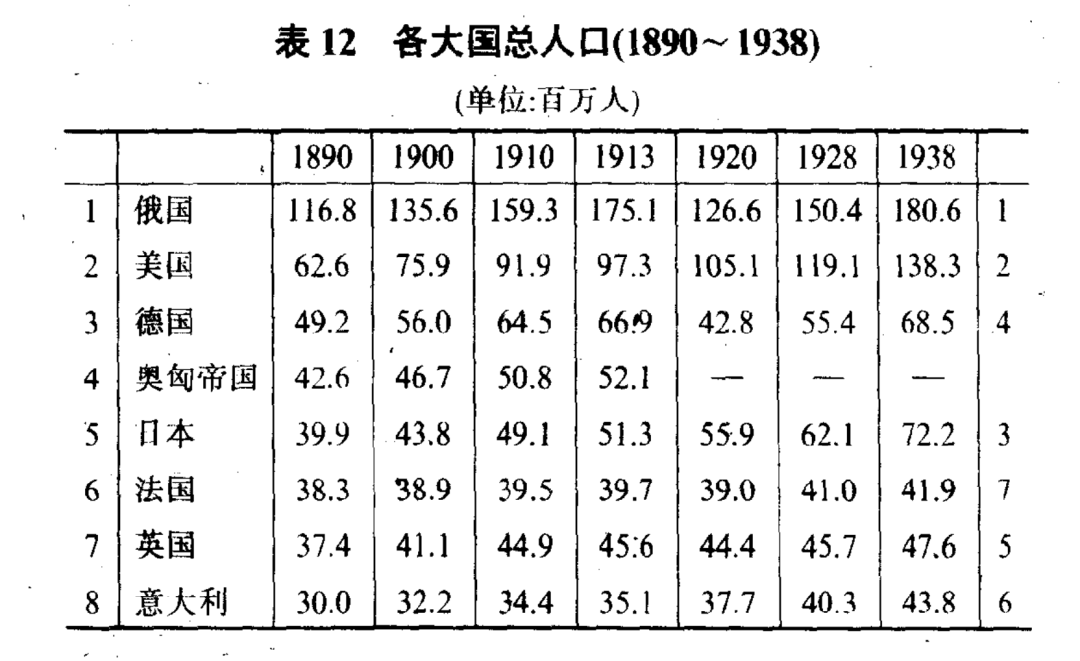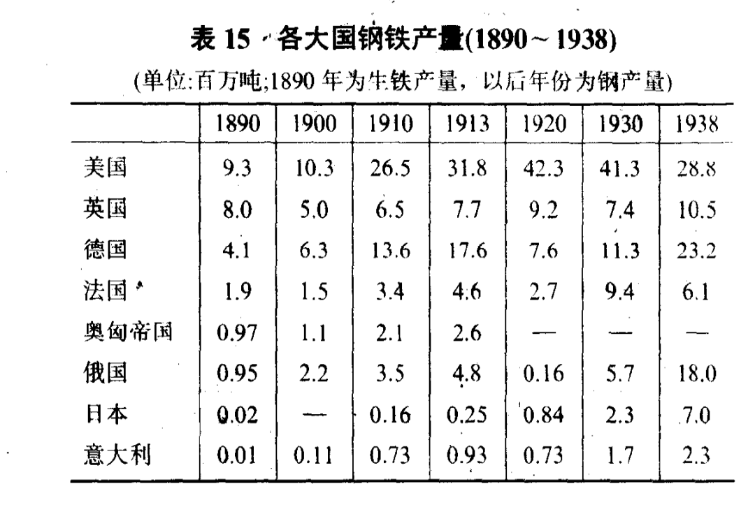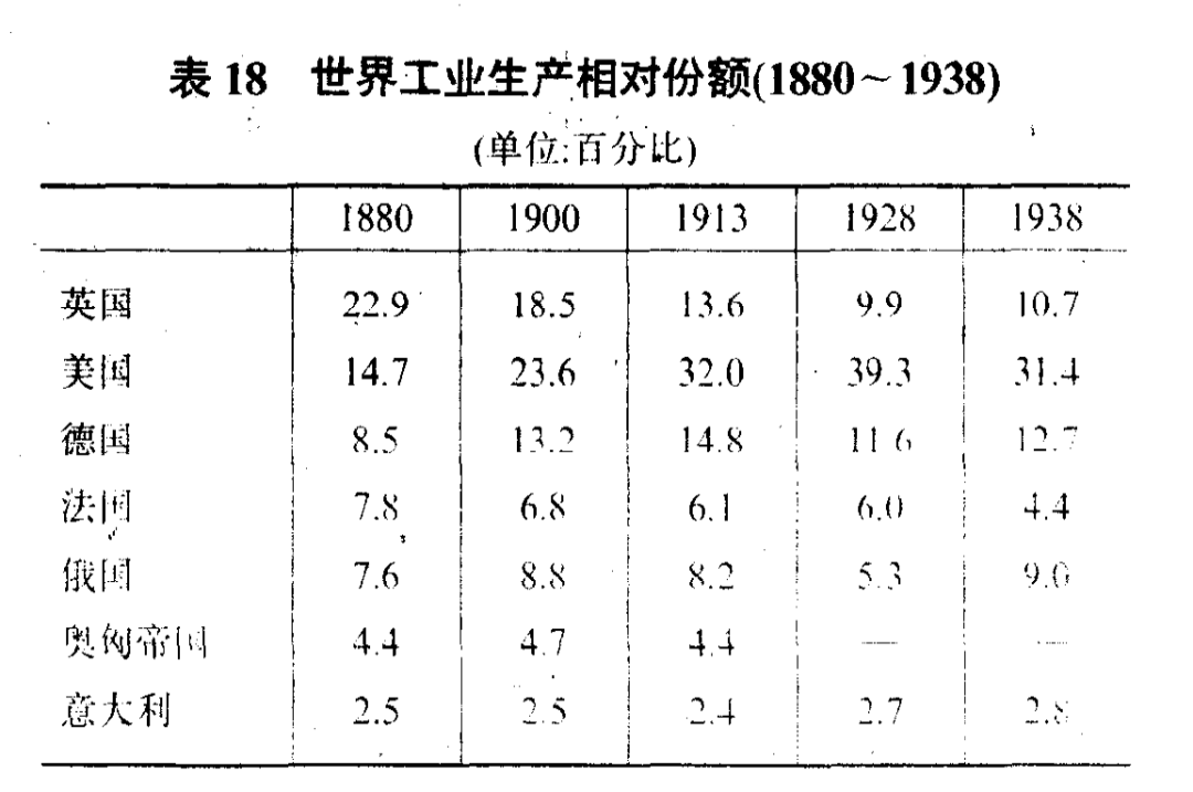 保羅肯尼迪在《大國的興衰》一書中,統計了世界大國的實力對比。那時還沒有GDP這個概念,各國之間的統計基於工業生產。