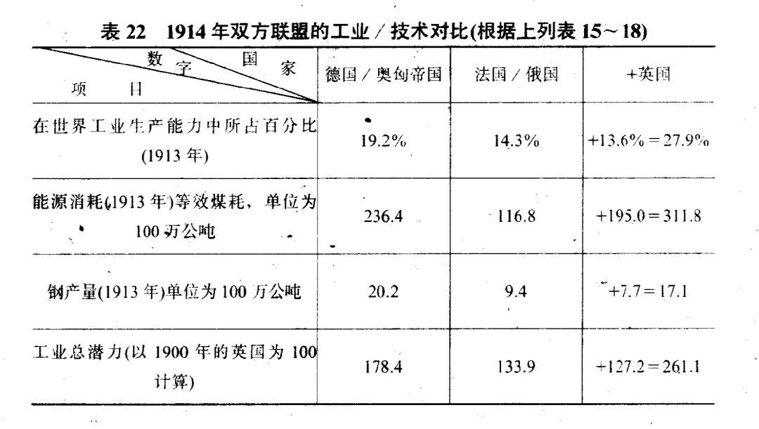 1913年,德國的鋼產量達到英國的兩倍,單獨一個國家的工業生產就超過了英國。與法俄聯盟相比,德奧聯盟在工業生產,能源消耗和鋼產量上佔據了壓倒性的優勢。如果英國不捲入歐洲戰爭,法俄兩國已經遠不是德奧的對手。英國加入後,才能維持平衡。